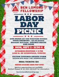 Guest speaker at 2:00 PM (Steven T.). Pulled Pork Sandwiches, Refreshments, Snow Cones, and a Bounce House for the kids. Bring your chairs and sit on the grass to enjoy fellowship and music by Mike Renwick and Friends.
